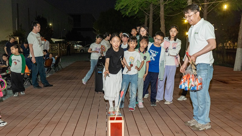 除了令人垂涎的烧烤,亲子互动游戏更是将现场气氛推向了高潮。在温暖的灯光映照下,套圈区域与投壶场地热闹非凡。小朋友们瞄准目标奋力抛出套圈,家长们在一旁加油助威,还不时给出小技巧;投壶场地里,大家全神贯注,调整姿势将箭矢投出,每当有箭矢稳稳落入壶中,现场便会爆发出一阵欢呼与掌声。