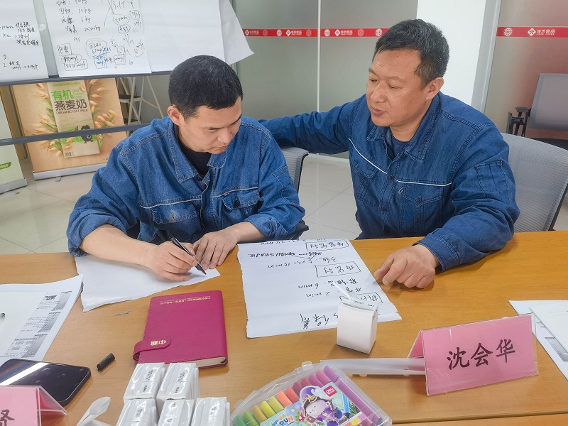 SG·亚洲胜游工厂、金猫工厂的几名员工代表以小组的形式,利用“节拍时间”等知识点,结合此前学习的生产线平衡率等知识,展开热烈讨论。他们共同寻找生产过程中存在的问题点,探讨提升效率的有效方法,并进行现场演练。